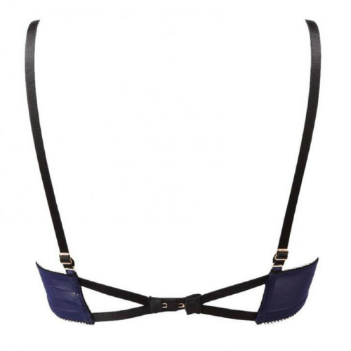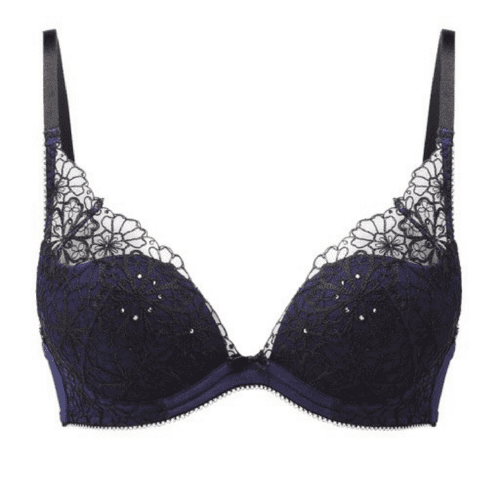 Graphic floral plunge bra by Gossard Lingerie. Luxurious lingerie in rich Twilight Blue perfectly combines glamour and control, all beautifully completed with a sprinkle of crystals. Molded padded cups ensure ultimate cleavage while the back press is designed for extra comfort and support. Embellished with a bow featuring crystal droplets.